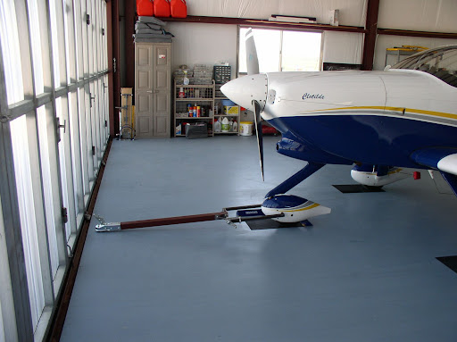 The hangar door is a Horton Door. I am very satisfied with this door, I first came across this door at Cypress Creek Airpark in Houston. It impressed me how easy it was to open and close, the amount of light that gets through and the fact that it can be open as much as you need and only limited by the width of the panels. My door is 42 feet wide, has 12 panels, 38 inches per panel. Six panels open to the left and six to the right. The door rides on a channel that is installed flushed with the concrete. Although the installation of the channel seems to be difficult when you read the instructions it actually is very simple. Just follow the dimensions given in the installation instructions. The folks at Horton in Kansas are very customer oriented. I certainly recomend this door to other future builders. There are picture of this door that you can see in this blog. http://www.hortonstackdoor.com/